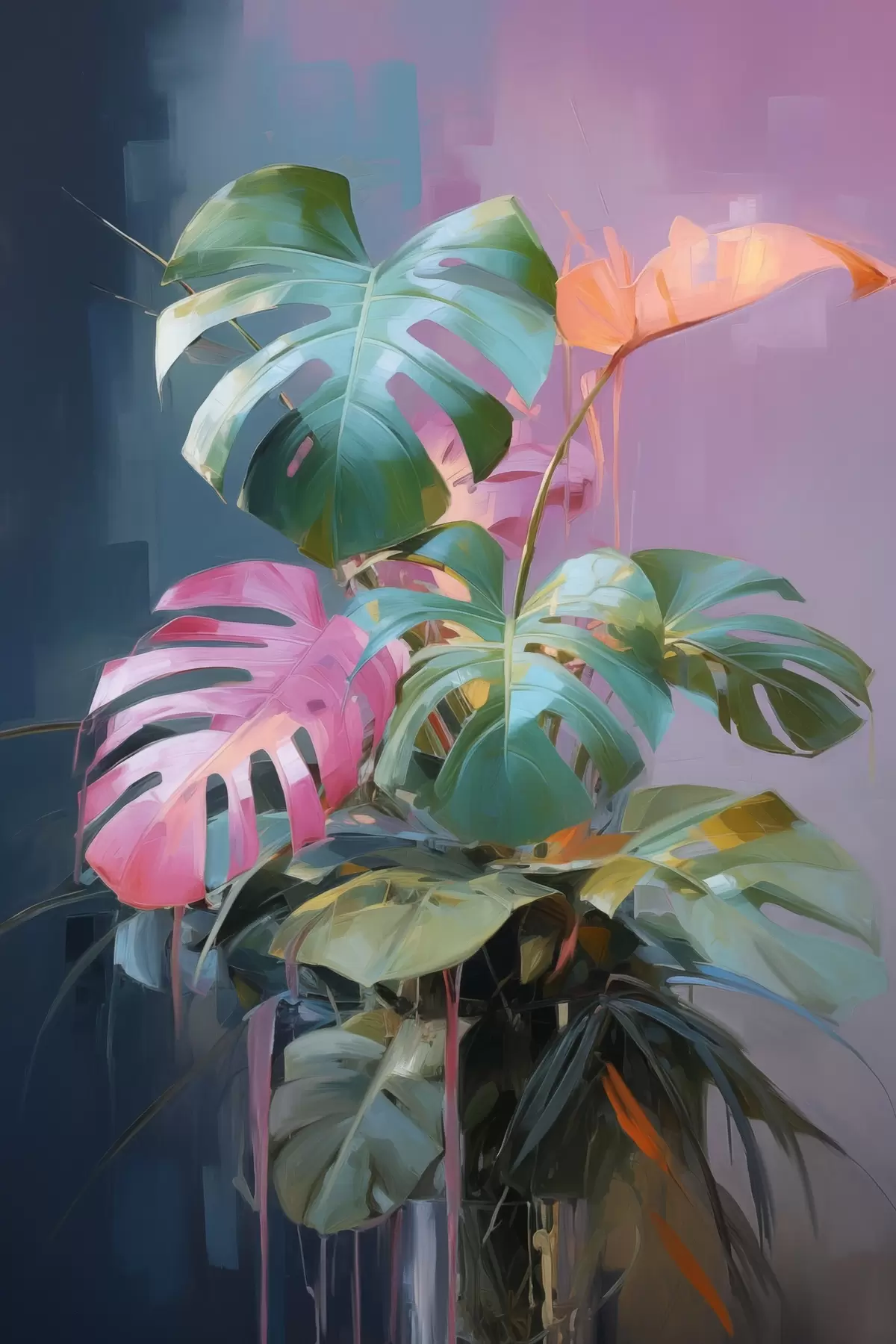 Poster Planta monstera abstracta con hojas rosas y verdes, colores vibrantes, sobre un fondo difuminado f46287