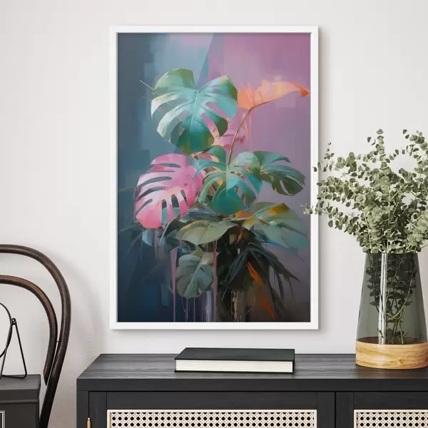 Poster Planta monstera abstracta con hojas rosas y verdes, colores vibrantes, sobre un fondo difuminado Nr f46287