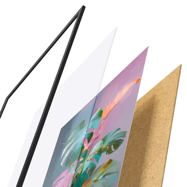 El póster consta de marco, plexiglás, imagen impresa y soporte de aglomerado. El póster puede colgarse inmediatamente en la pared gracias a los soportes de la parte posterior.
