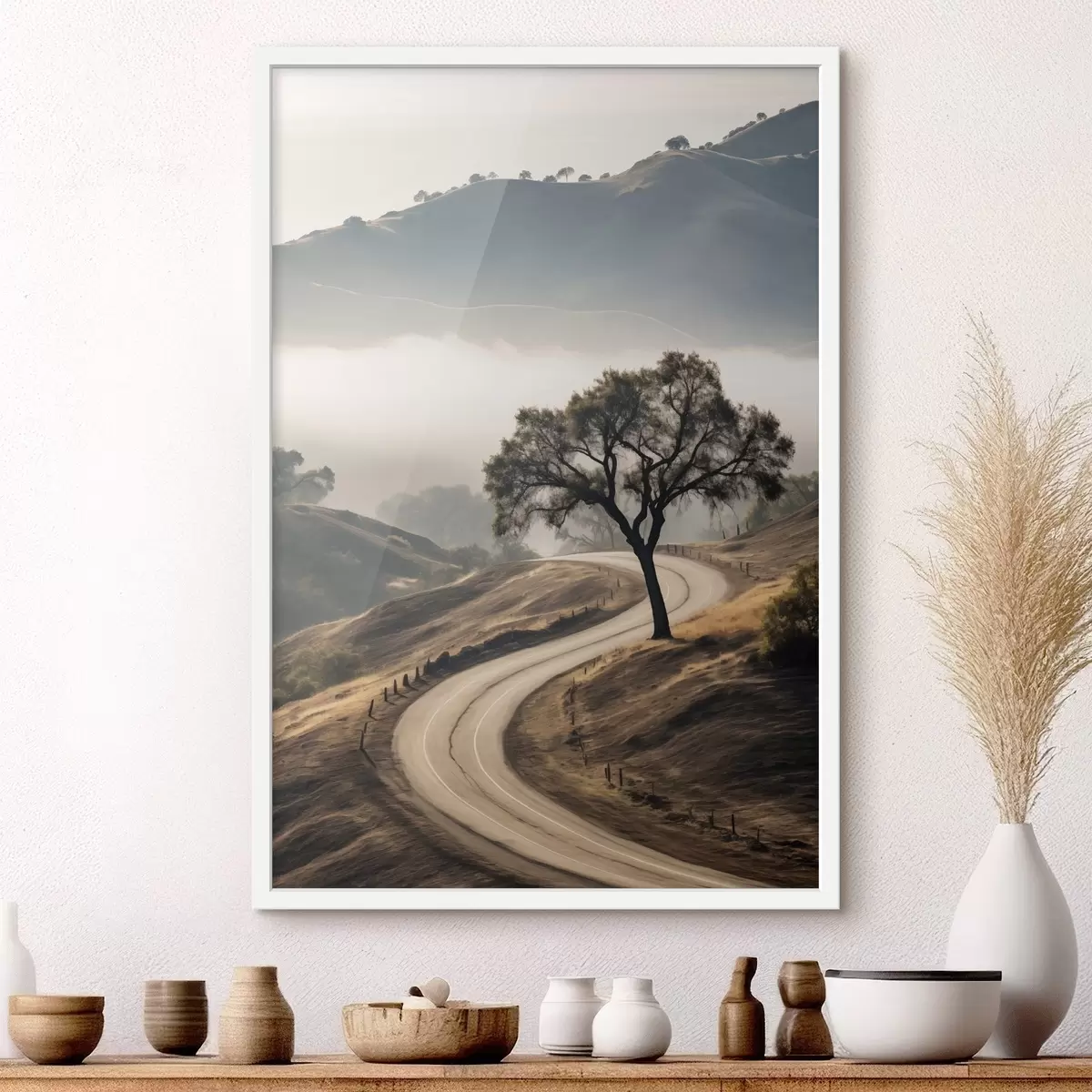 Poster Una carretera sinuosa que atraviesa colinas onduladas con un árbol en primer plano, y un fondo con niebla y montañas f46288