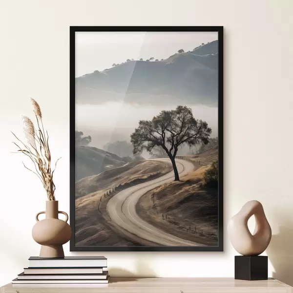 Poster Una carretera sinuosa que atraviesa colinas onduladas con un árbol en primer plano, y un fondo con niebla y montañas Nr f46288
