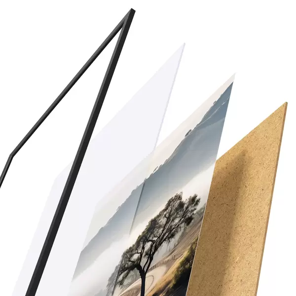 El póster consta de marco, plexiglás, imagen impresa y soporte de aglomerado. El póster puede colgarse inmediatamente en la pared gracias a los soportes de la parte posterior.