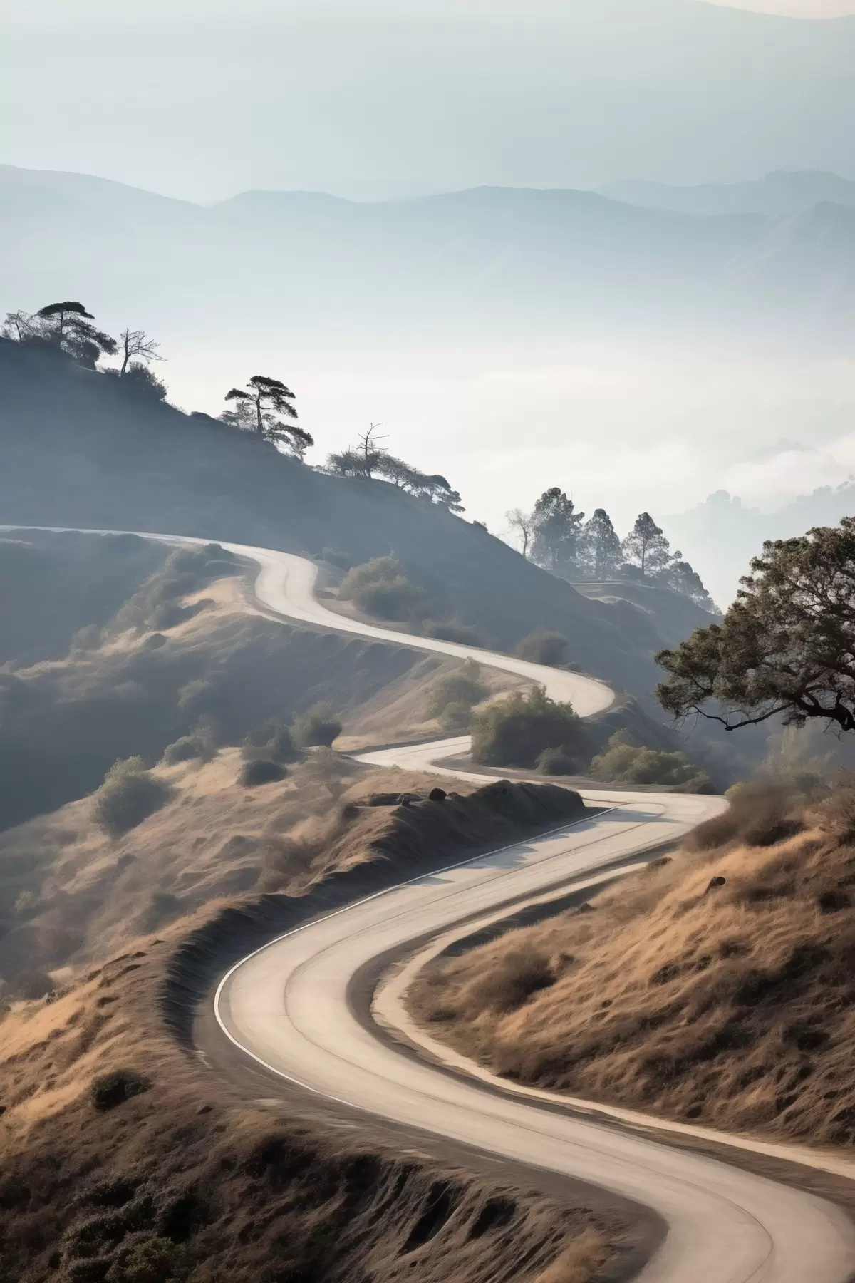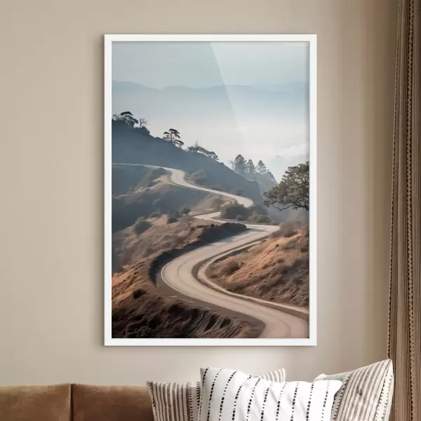 Poster Una sinuosa carretera que atraviesa un paisaje montañoso con hierba seca bajo un cielo despejado y montañas en la distancia. f46289
