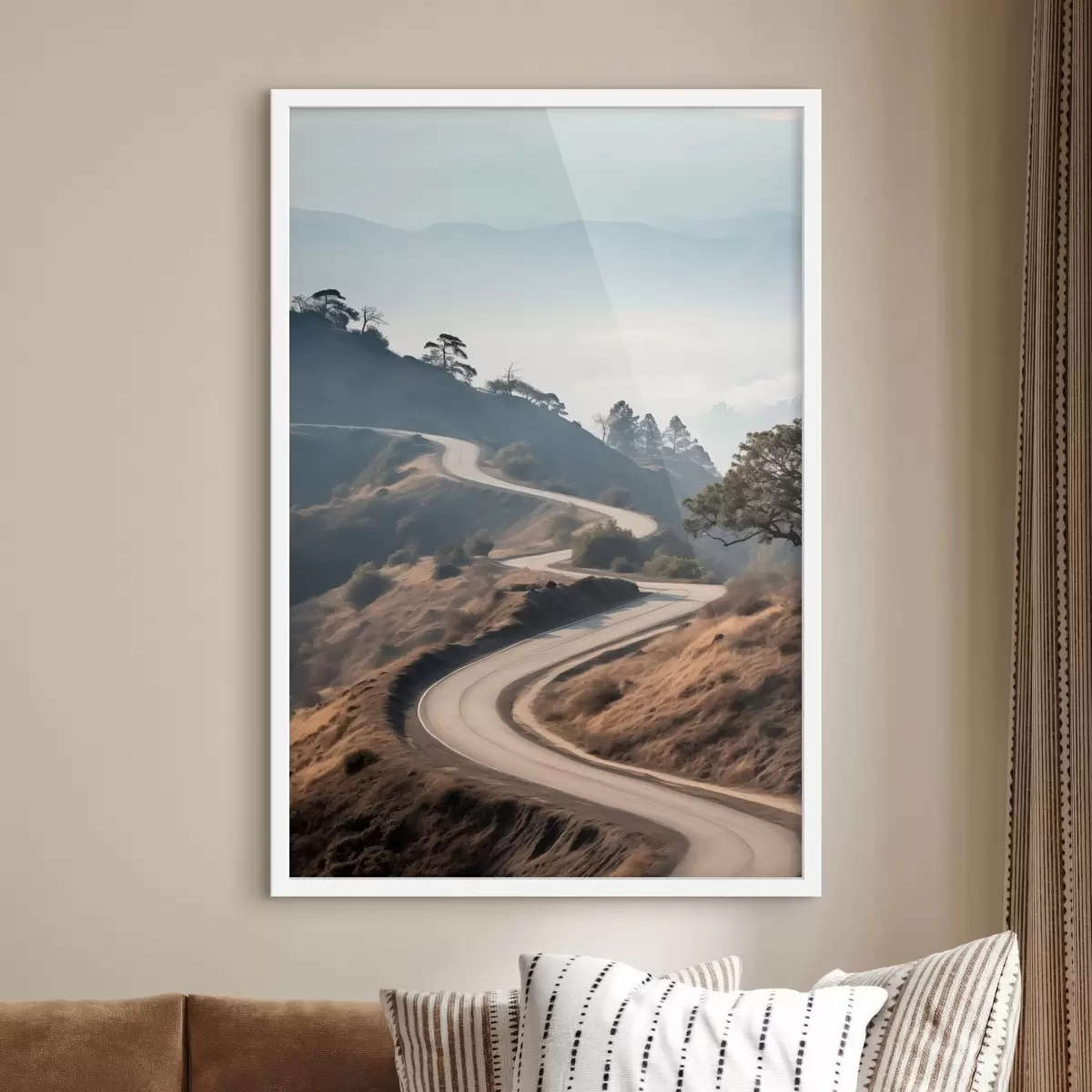 Poster Una sinuosa carretera que atraviesa un paisaje montañoso con hierba seca bajo un cielo despejado y montañas en la distancia. Nr f46289