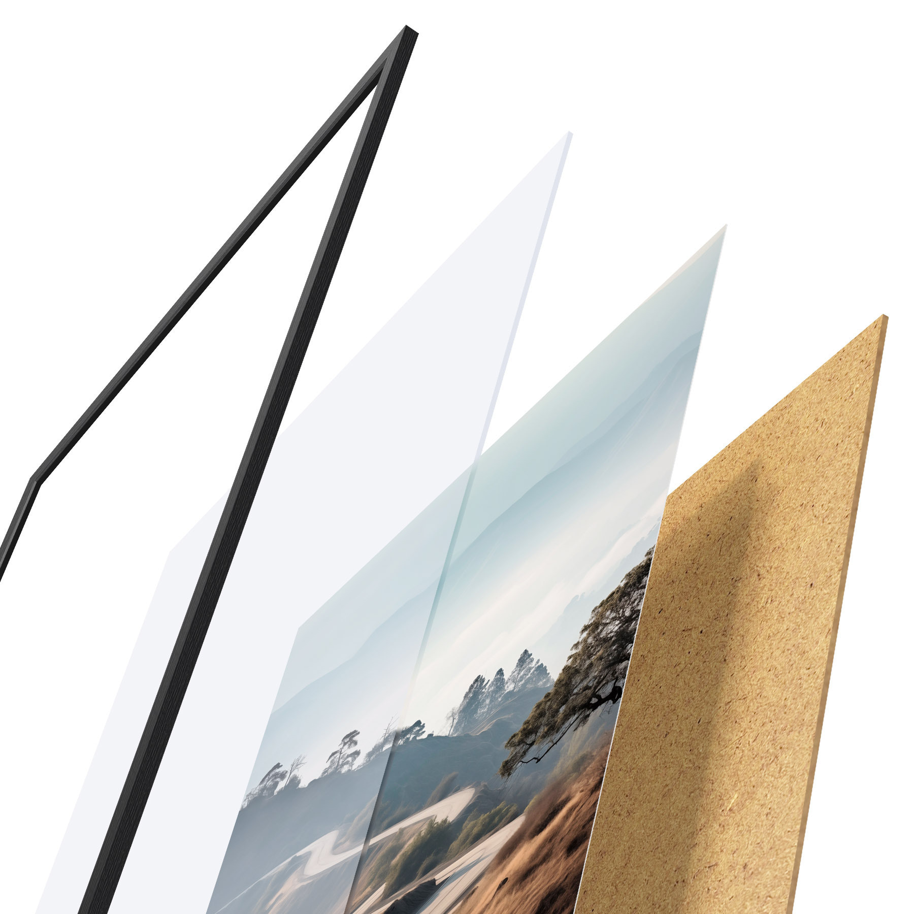 El póster consta de marco, plexiglás, imagen impresa y soporte de aglomerado. El póster puede colgarse inmediatamente en la pared gracias a los soportes de la parte posterior.