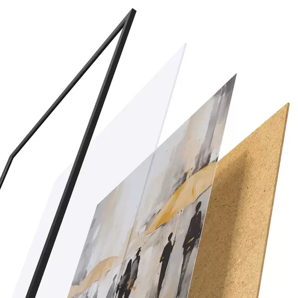 El póster consta de marco, plexiglás, imagen impresa y soporte de aglomerado. El póster puede colgarse inmediatamente en la pared gracias a los soportes de la parte posterior.