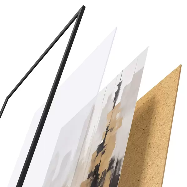 El póster consta de marco, plexiglás, imagen impresa y soporte de aglomerado. El póster puede colgarse inmediatamente en la pared gracias a los soportes de la parte posterior.