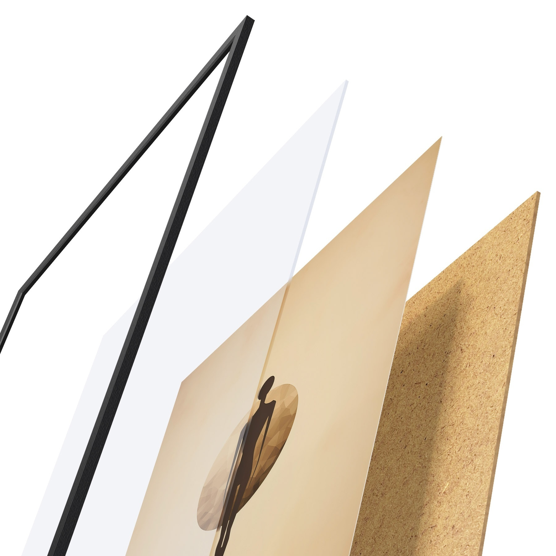 El póster consta de marco, plexiglás, imagen impresa y soporte de aglomerado. El póster puede colgarse inmediatamente en la pared gracias a los soportes de la parte posterior.