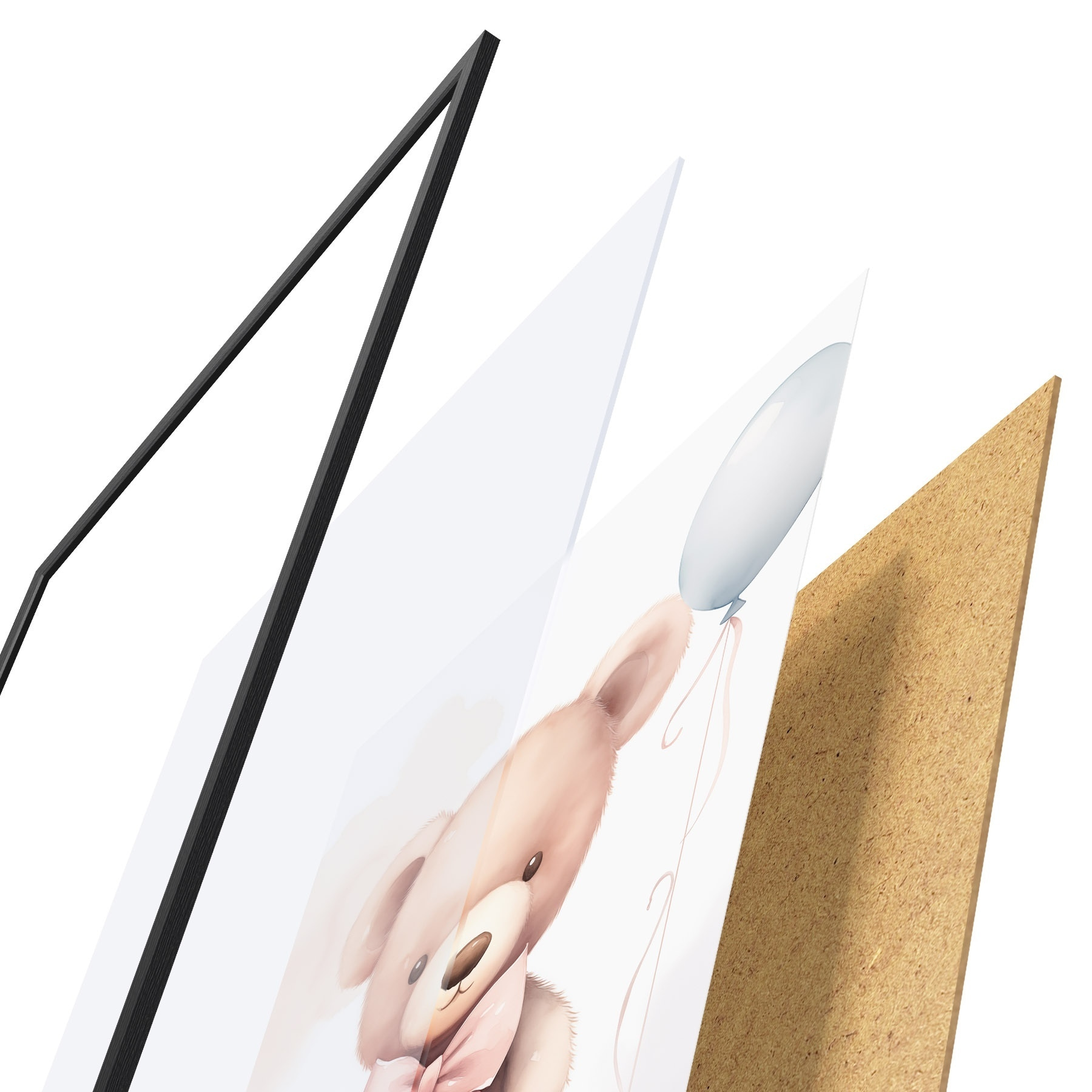 El póster consta de marco, plexiglás, imagen impresa y soporte de aglomerado. El póster puede colgarse inmediatamente en la pared gracias a los soportes de la parte posterior.