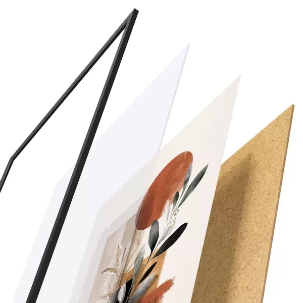 El póster consta de marco, plexiglás, imagen impresa y soporte de aglomerado. El póster puede colgarse inmediatamente en la pared gracias a los soportes de la parte posterior.