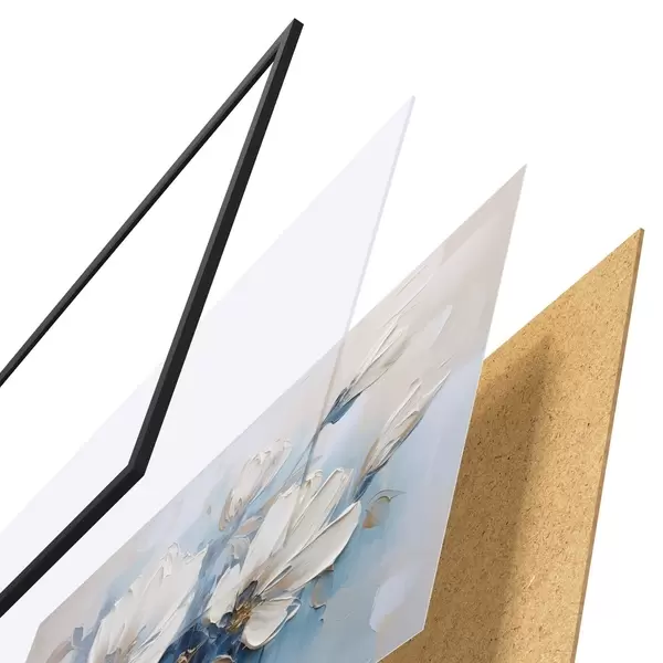 El póster consta de marco, plexiglás, imagen impresa y soporte de aglomerado. El póster puede colgarse inmediatamente en la pared gracias a los soportes de la parte posterior.