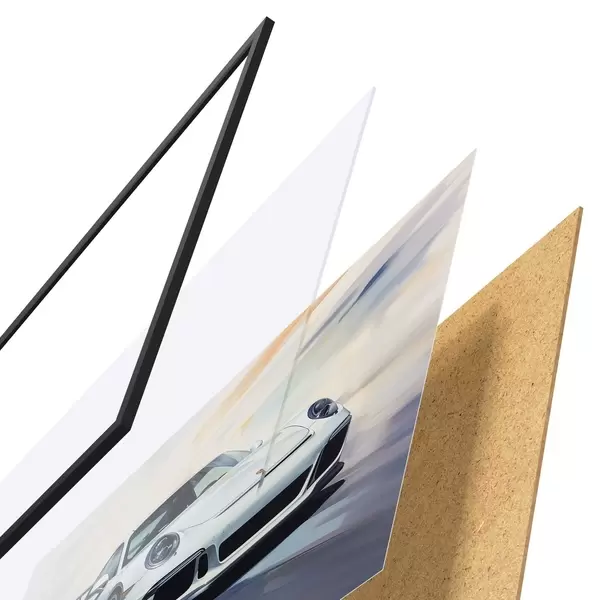 El póster consta de marco, plexiglás, imagen impresa y soporte de aglomerado. El póster puede colgarse inmediatamente en la pared gracias a los soportes de la parte posterior.