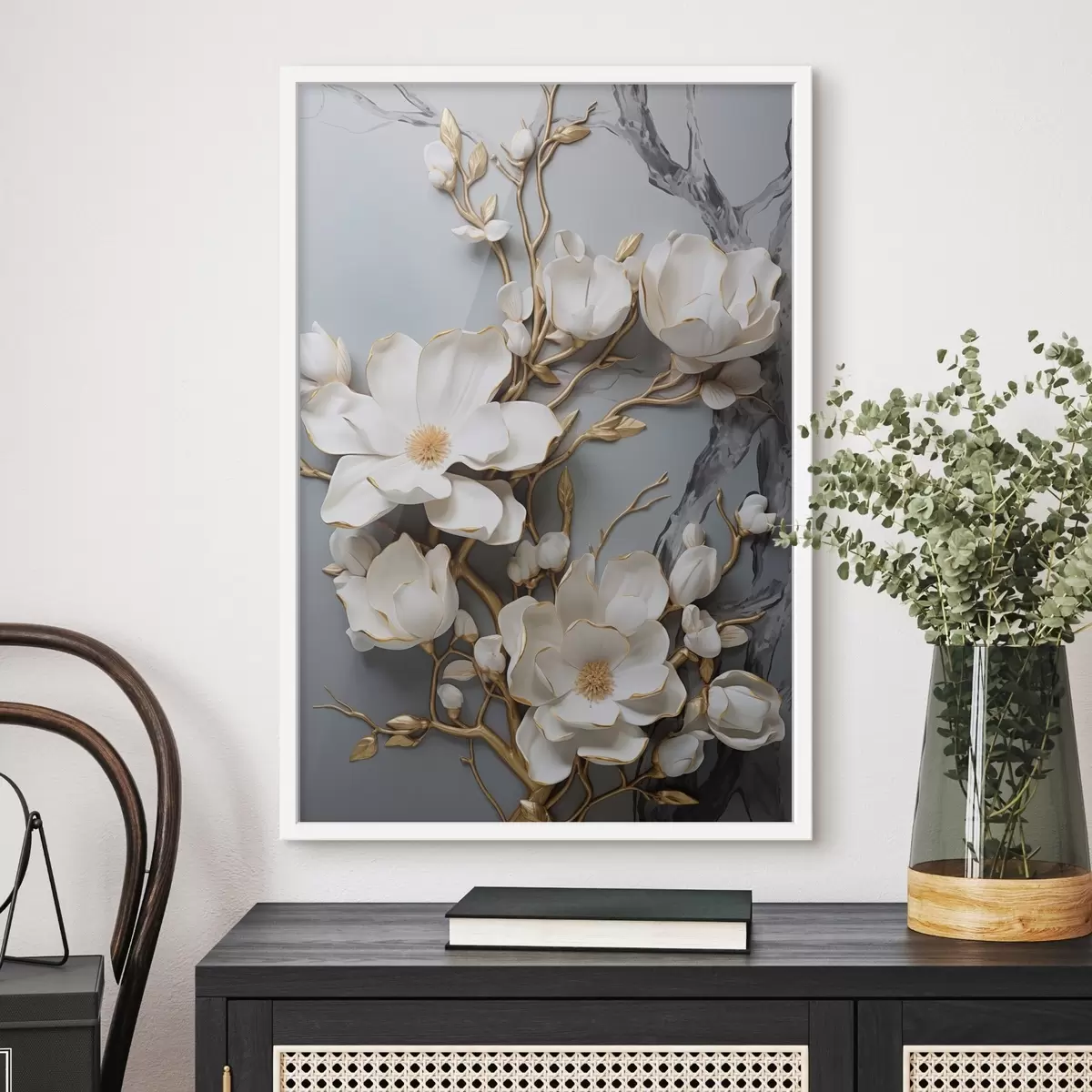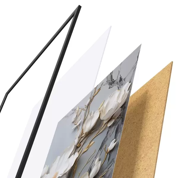 El póster consta de marco, plexiglás, imagen impresa y soporte de aglomerado. El póster puede colgarse inmediatamente en la pared gracias a los soportes de la parte posterior.