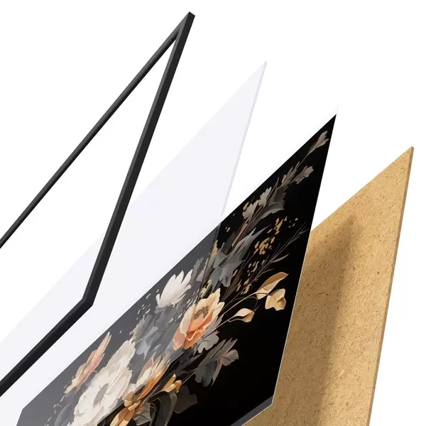 El póster consta de marco, plexiglás, imagen impresa y soporte de aglomerado. El póster puede colgarse inmediatamente en la pared gracias a los soportes de la parte posterior.