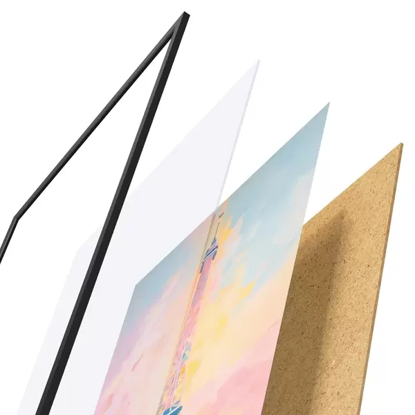 El póster consta de marco, plexiglás, imagen impresa y soporte de aglomerado. El póster puede colgarse inmediatamente en la pared gracias a los soportes de la parte posterior.