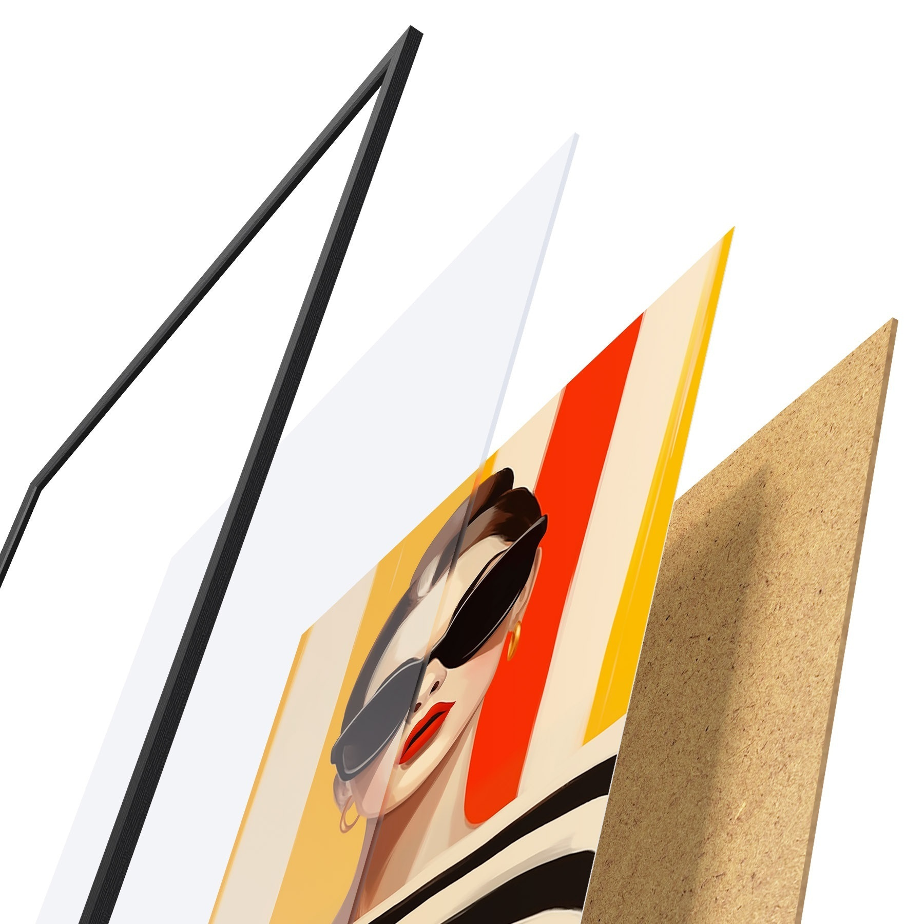 El póster consta de marco, plexiglás, imagen impresa y soporte de aglomerado. El póster puede colgarse inmediatamente en la pared gracias a los soportes de la parte posterior.