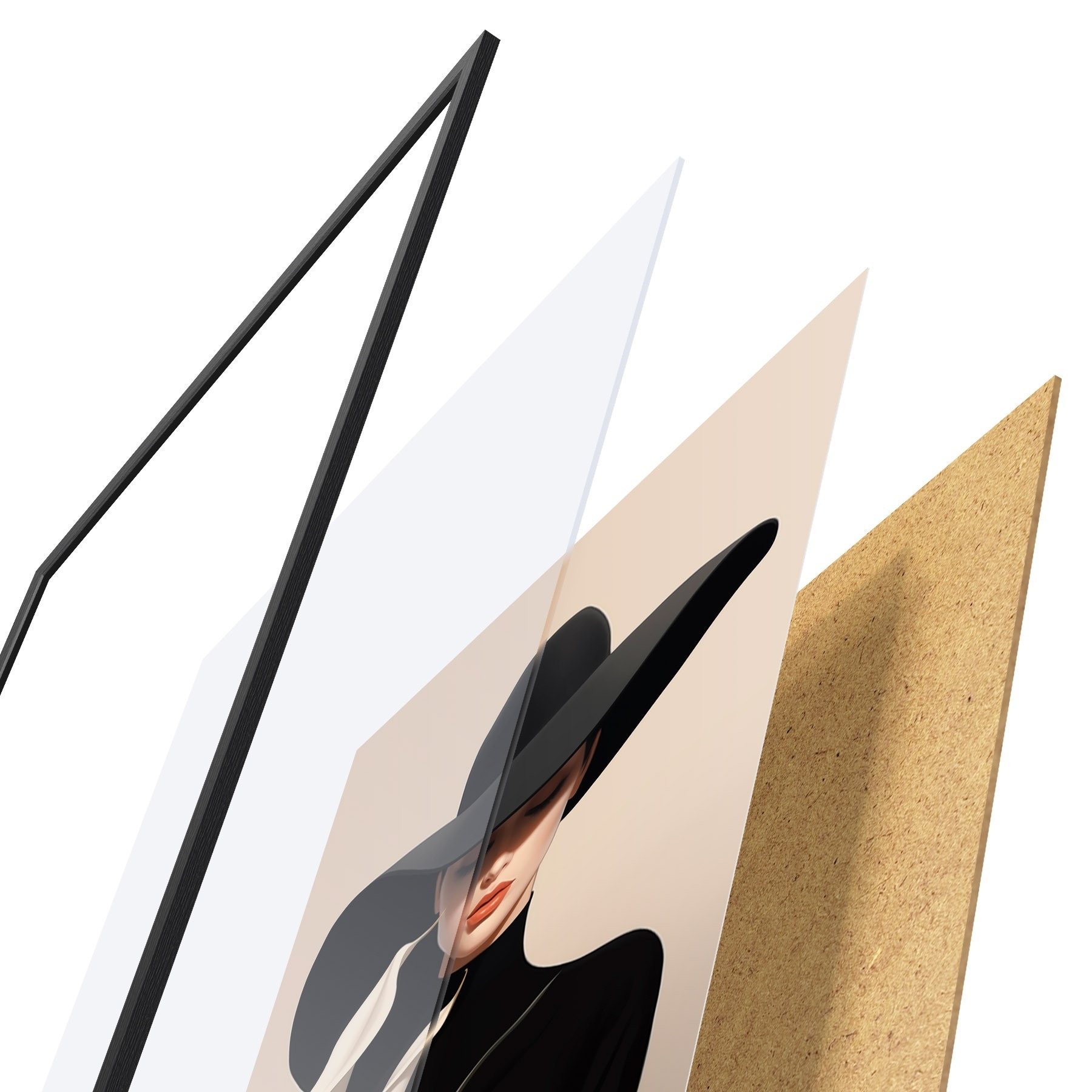 El póster consta de marco, plexiglás, imagen impresa y soporte de aglomerado. El póster puede colgarse inmediatamente en la pared gracias a los soportes de la parte posterior.