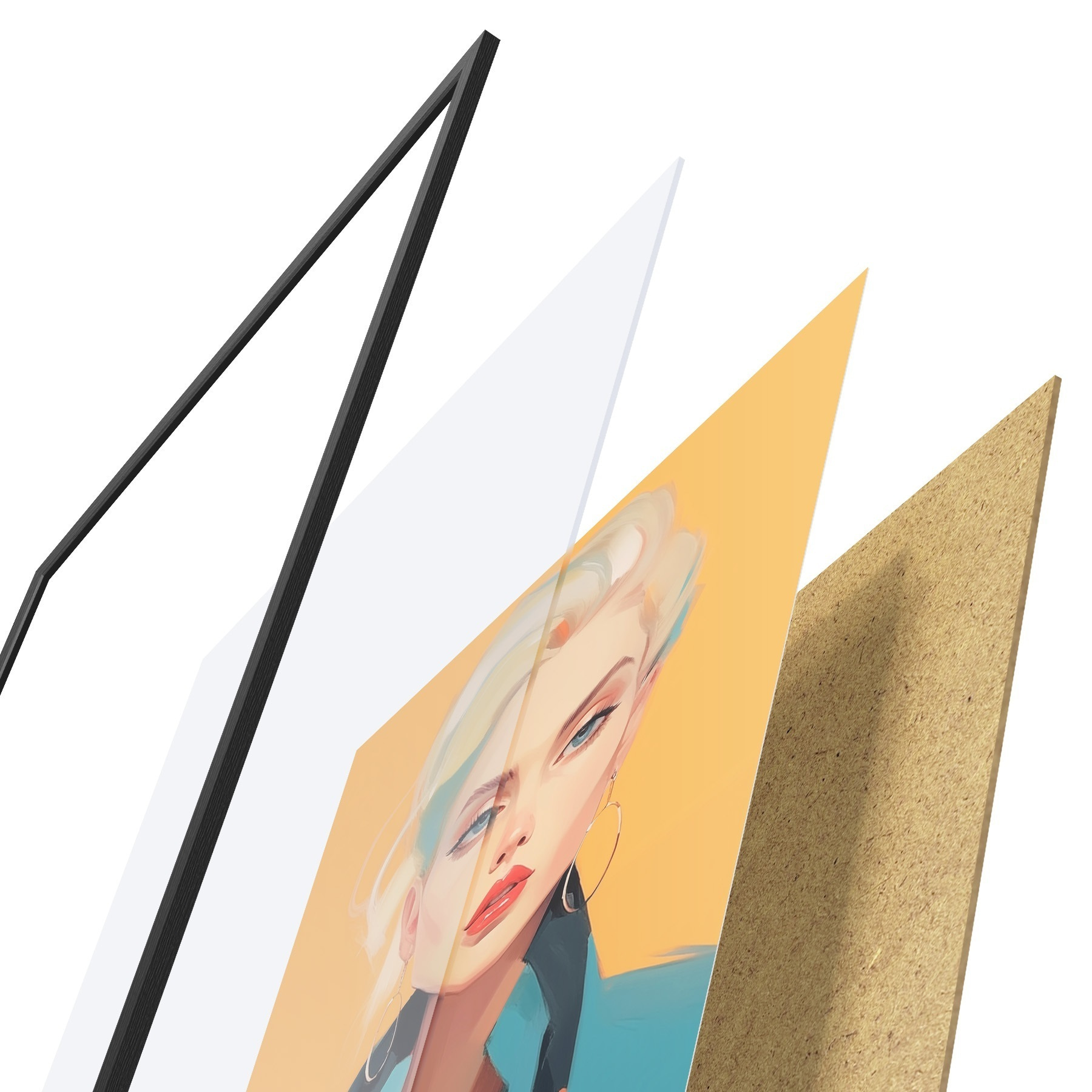 El póster consta de marco, plexiglás, imagen impresa y soporte de aglomerado. El póster puede colgarse inmediatamente en la pared gracias a los soportes de la parte posterior.