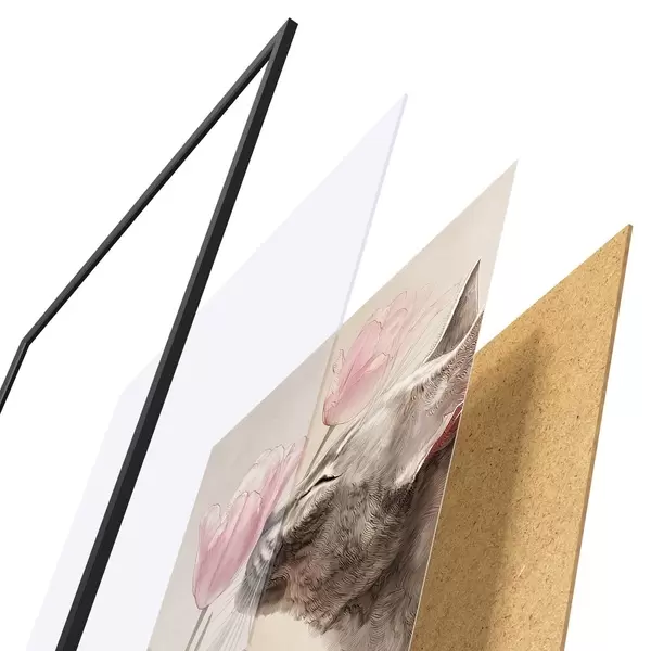 El póster consta de marco, plexiglás, imagen impresa y soporte de aglomerado. El póster puede colgarse inmediatamente en la pared gracias a los soportes de la parte posterior.