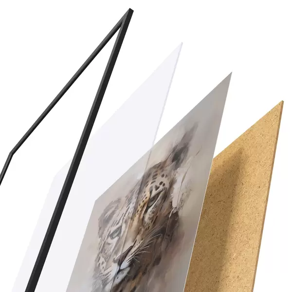 El póster consta de marco, plexiglás, imagen impresa y soporte de aglomerado. El póster puede colgarse inmediatamente en la pared gracias a los soportes de la parte posterior.