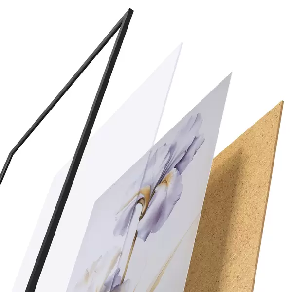 El póster consta de marco, plexiglás, imagen impresa y soporte de aglomerado. El póster puede colgarse inmediatamente en la pared gracias a los soportes de la parte posterior.