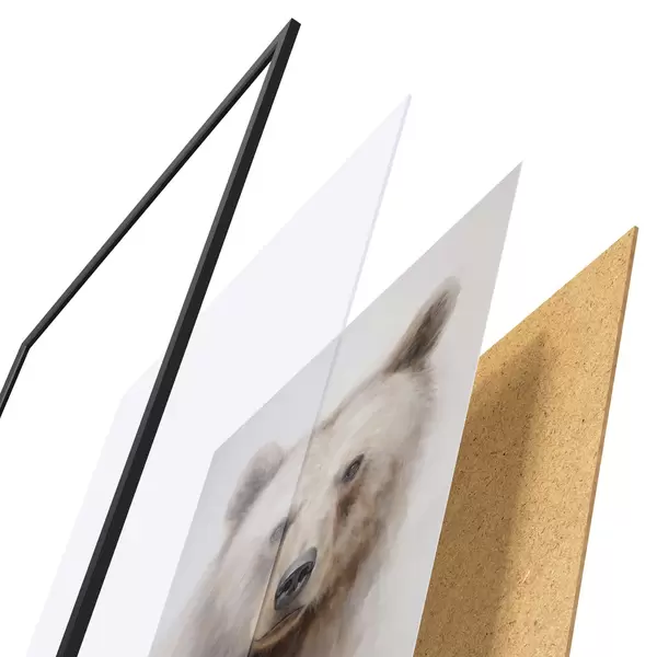 El póster consta de marco, plexiglás, imagen impresa y soporte de aglomerado. El póster puede colgarse inmediatamente en la pared gracias a los soportes de la parte posterior.