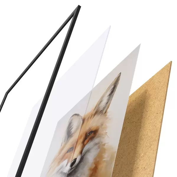 El póster consta de marco, plexiglás, imagen impresa y soporte de aglomerado. El póster puede colgarse inmediatamente en la pared gracias a los soportes de la parte posterior.