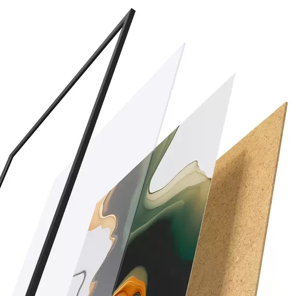 El póster consta de marco, plexiglás, imagen impresa y soporte de aglomerado. El póster puede colgarse inmediatamente en la pared gracias a los soportes de la parte posterior.