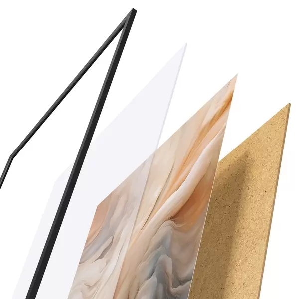 El póster consta de marco, plexiglás, imagen impresa y soporte de aglomerado. El póster puede colgarse inmediatamente en la pared gracias a los soportes de la parte posterior.