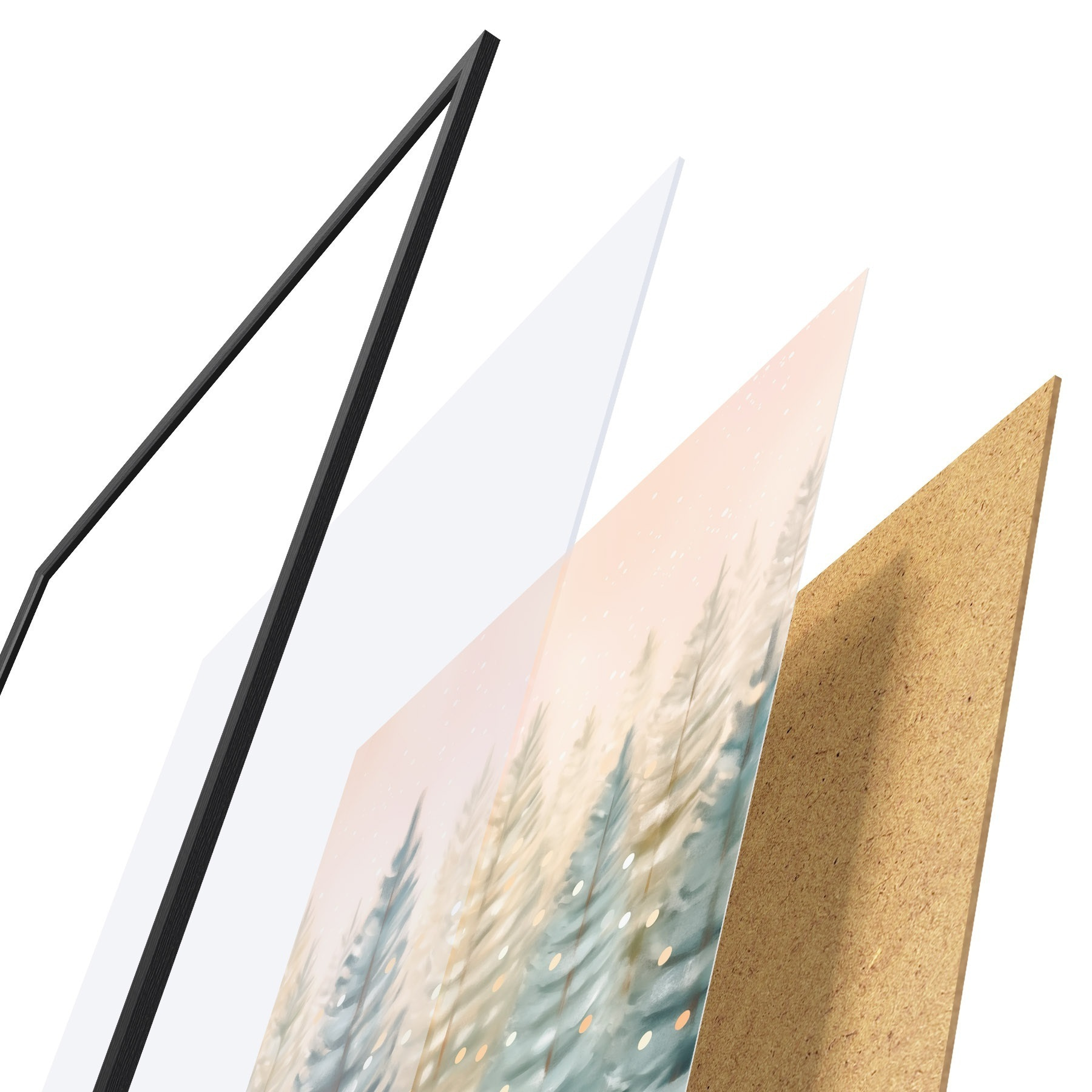 El póster consta de marco, plexiglás, imagen impresa y soporte de aglomerado. El póster puede colgarse inmediatamente en la pared gracias a los soportes de la parte posterior.