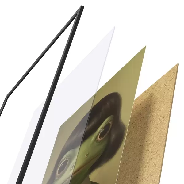 El póster consta de marco, plexiglás, imagen impresa y soporte de aglomerado. El póster puede colgarse inmediatamente en la pared gracias a los soportes de la parte posterior.