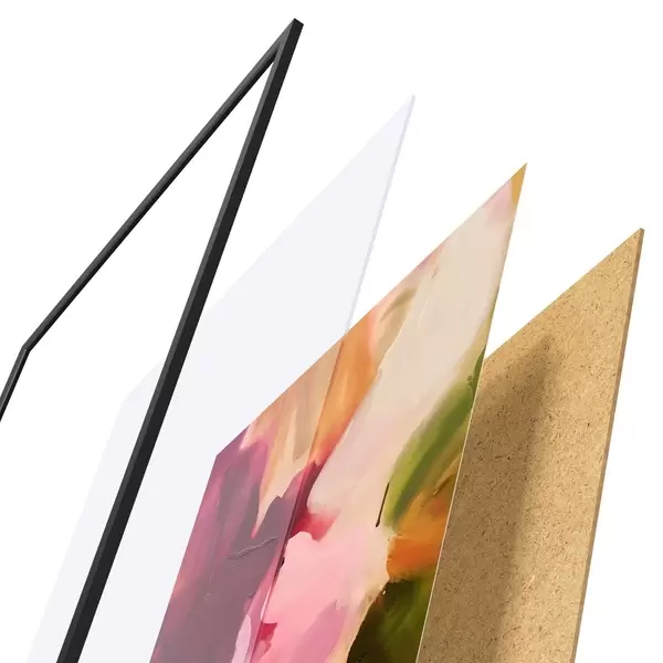El póster consta de marco, plexiglás, imagen impresa y soporte de aglomerado. El póster puede colgarse inmediatamente en la pared gracias a los soportes de la parte posterior.
