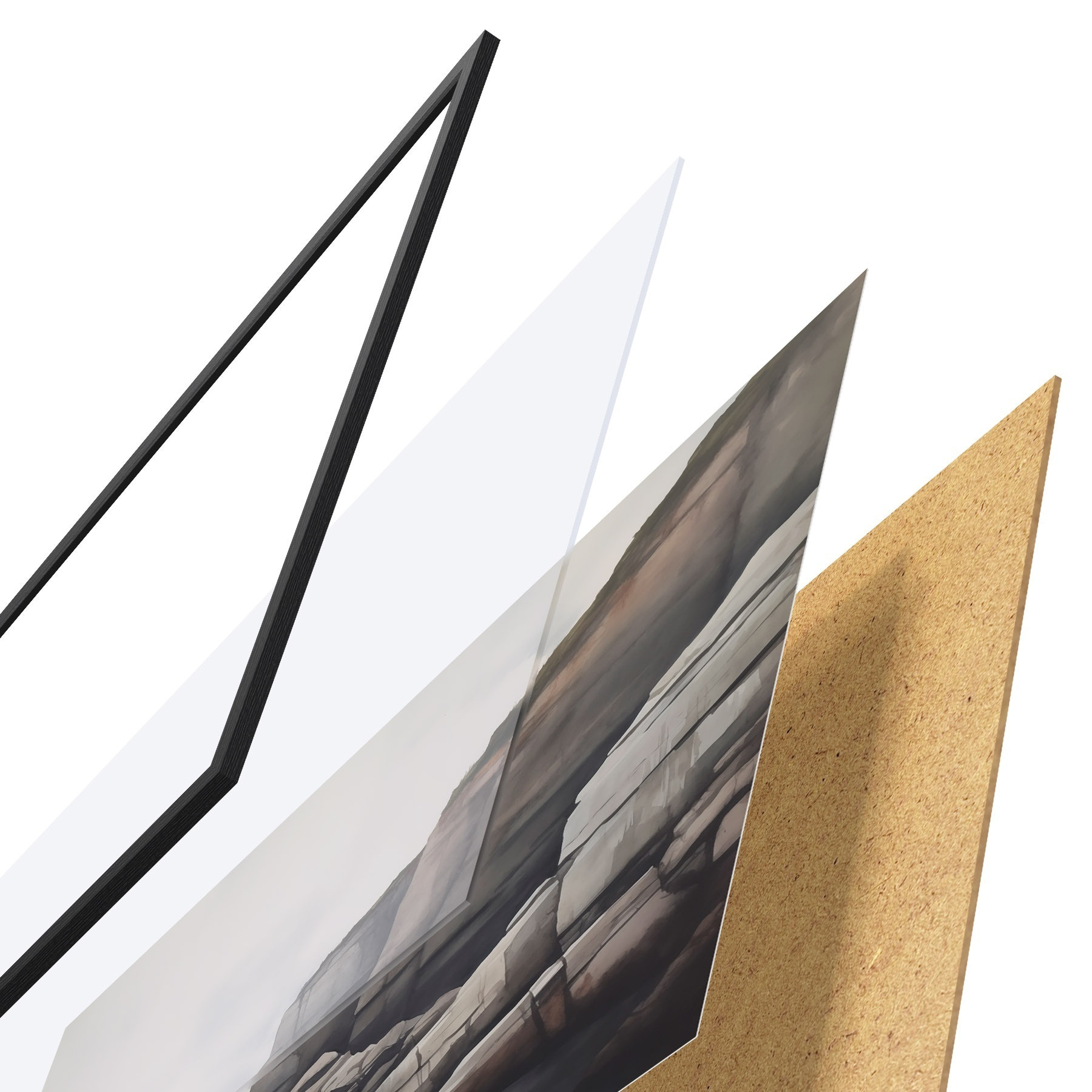 El póster consta de marco, plexiglás, imagen impresa y soporte de aglomerado. El póster puede colgarse inmediatamente en la pared gracias a los soportes de la parte posterior.