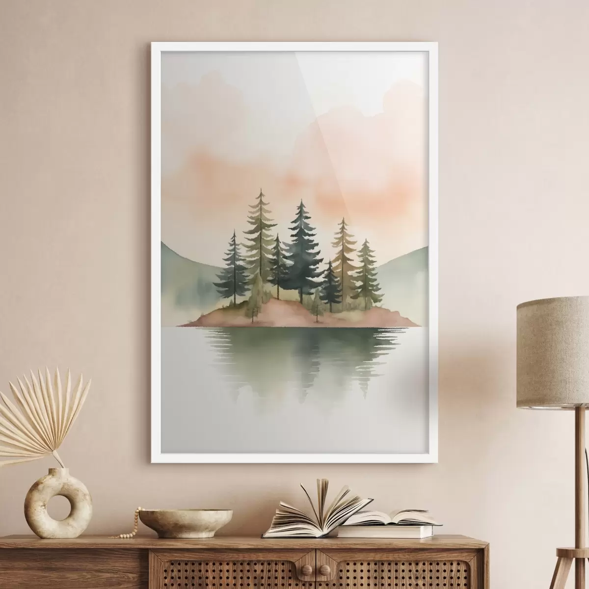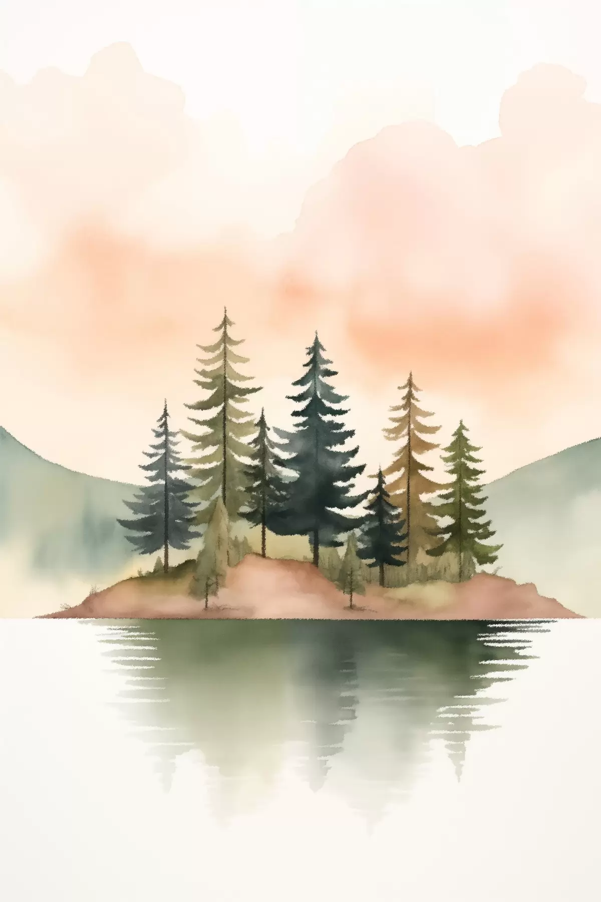 Poster Pinos acuarelados en un islote brumoso, cielo suave color melocotón. f46505