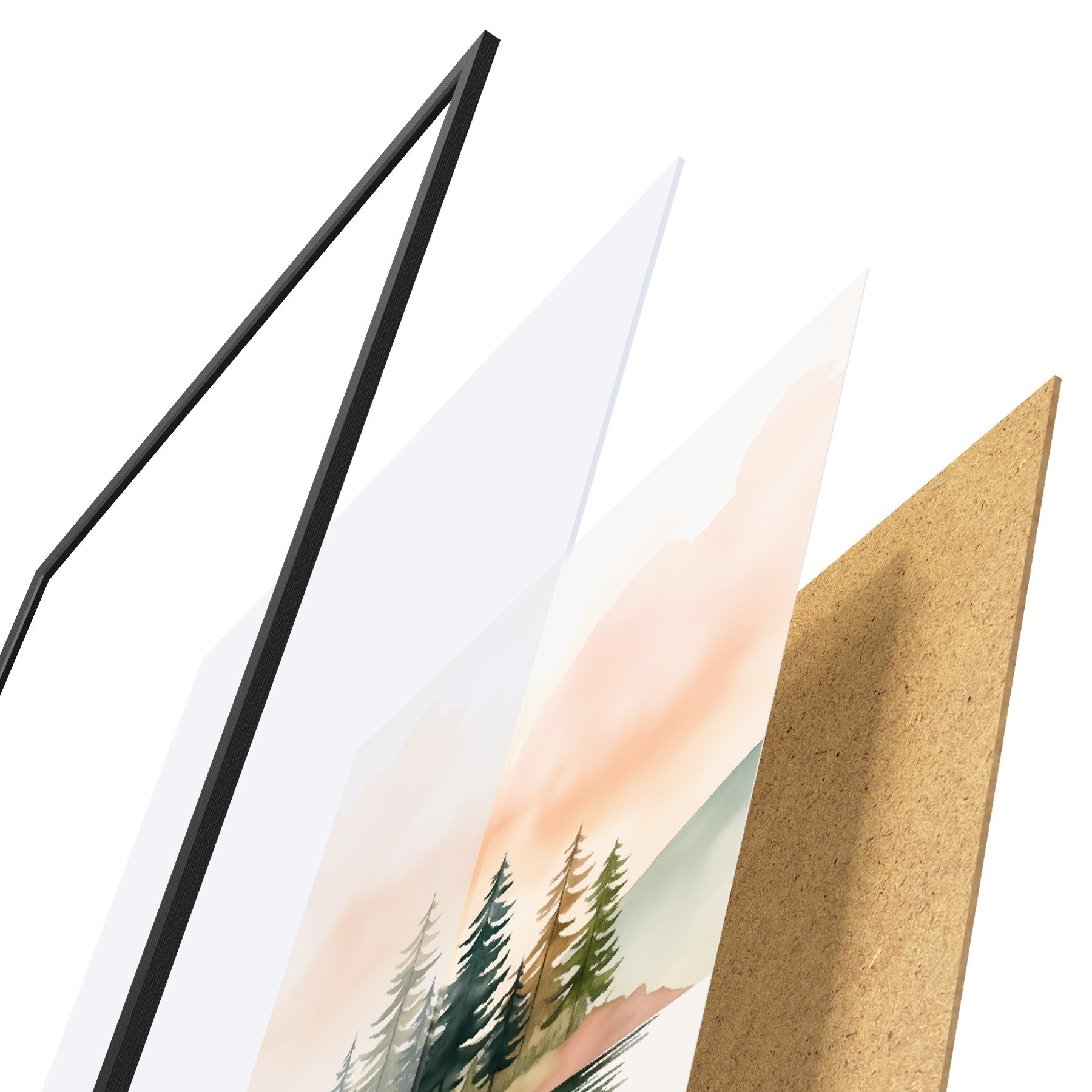 El póster consta de marco, plexiglás, imagen impresa y soporte de aglomerado. El póster puede colgarse inmediatamente en la pared gracias a los soportes de la parte posterior.