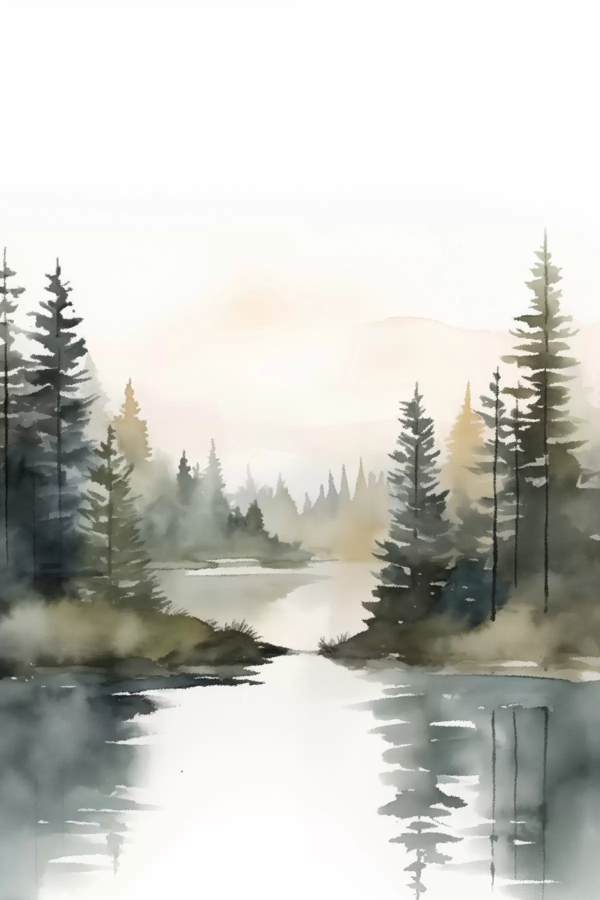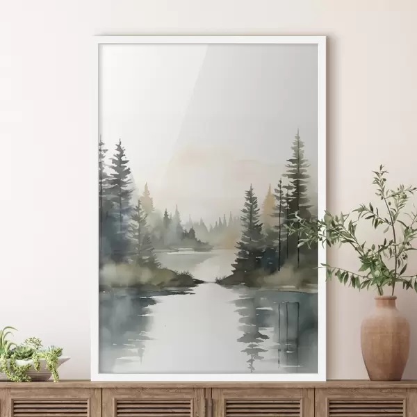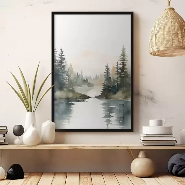 Poster Bosque brumoso de coníferas sobre un río tranquilo, estilo acuarela. f46507