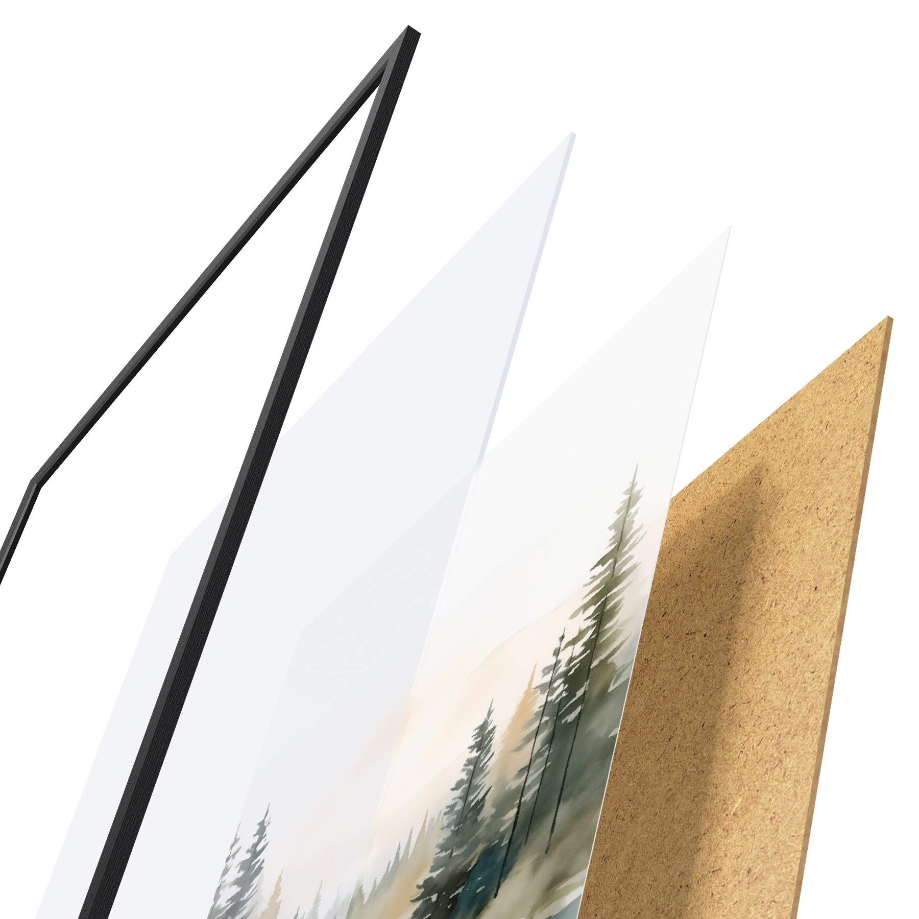 El póster consta de marco, plexiglás, imagen impresa y soporte de aglomerado. El póster puede colgarse inmediatamente en la pared gracias a los soportes de la parte posterior.