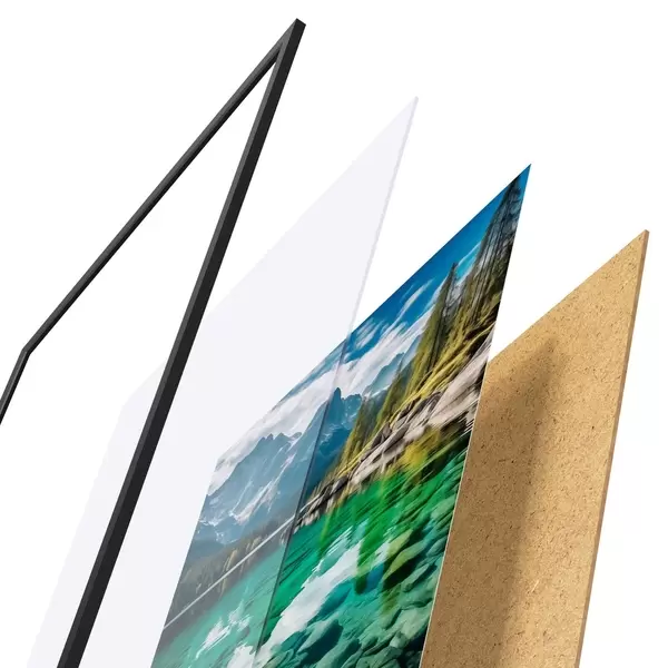 El póster consta de marco, plexiglás, imagen impresa y soporte de aglomerado. El póster puede colgarse inmediatamente en la pared gracias a los soportes de la parte posterior.