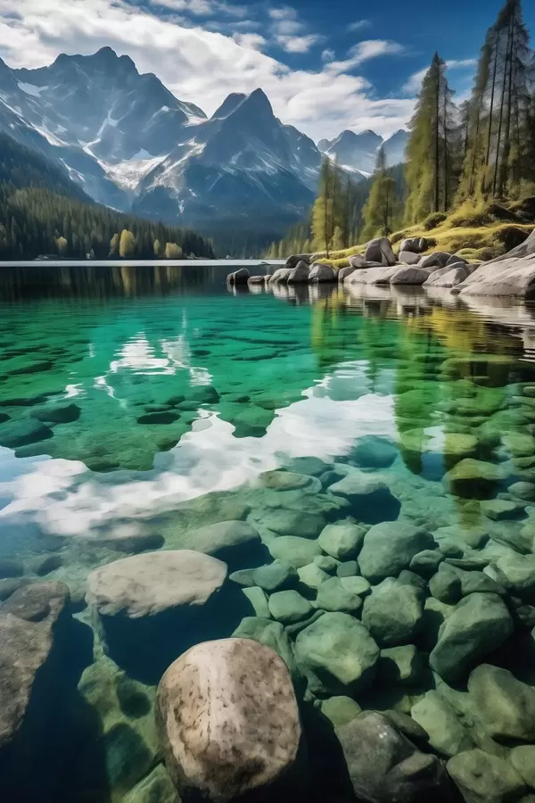 Poster Lago alpino esmeralda con rocas en el fondo y picos imponentes. Nr f46515