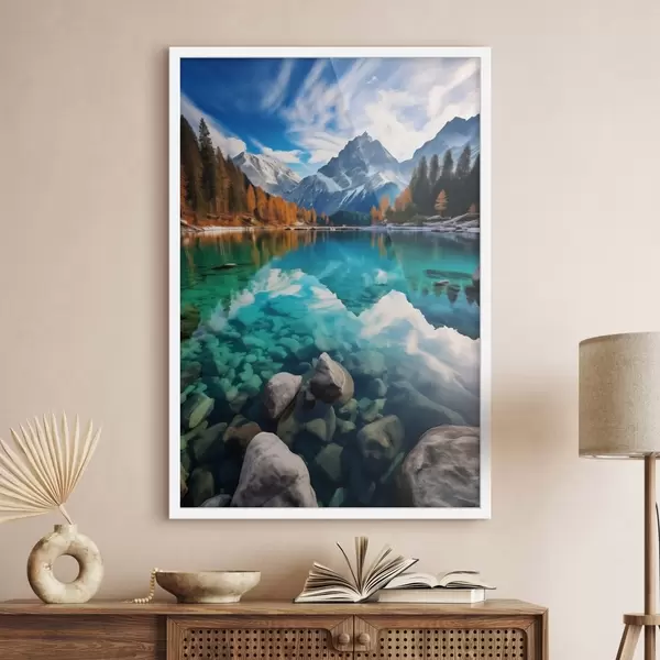 Poster Lago de montaña con aguas turquesas y alerces otoñales. Nr f46517