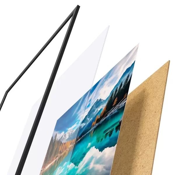 El póster consta de marco, plexiglás, imagen impresa y soporte de aglomerado. El póster puede colgarse inmediatamente en la pared gracias a los soportes de la parte posterior.