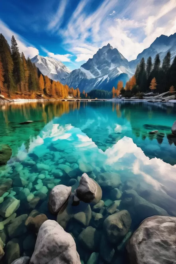 Poster Lago de montaña con aguas turquesas y alerces otoñales. f46517