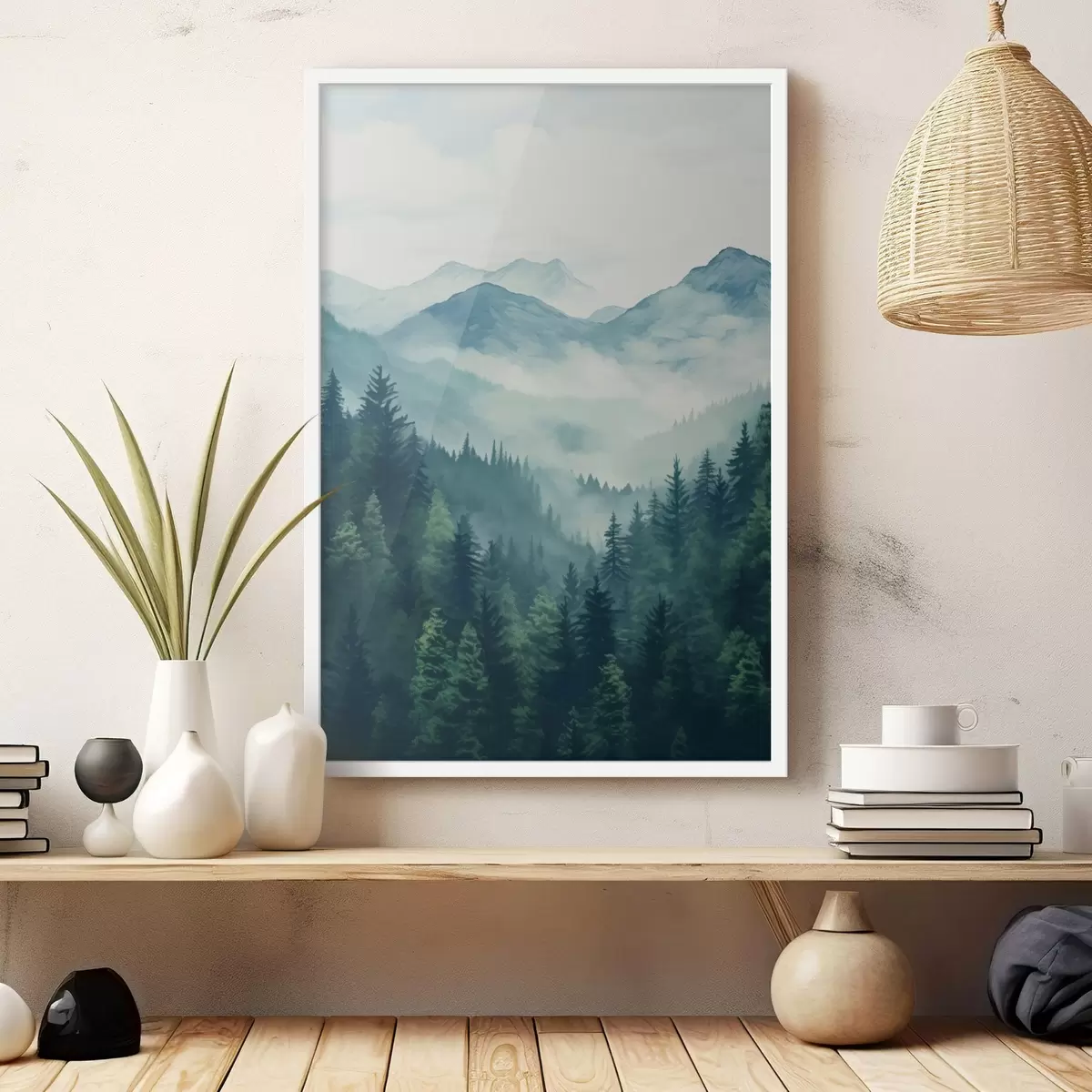 Poster Montañas y bosques pintados con acuarela en la suave bruma matinal. Nr f46519