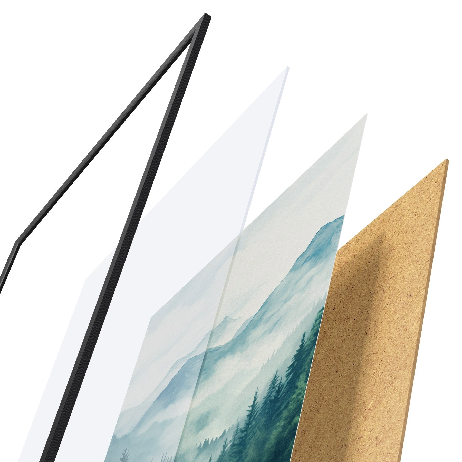 El póster consta de marco, plexiglás, imagen impresa y soporte de aglomerado. El póster puede colgarse inmediatamente en la pared gracias a los soportes de la parte posterior.