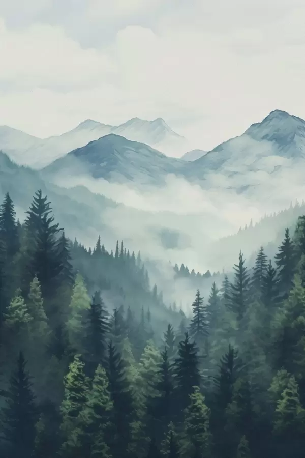 Poster Montañas y bosques pintados con acuarela en la suave bruma matinal. Nr f46519