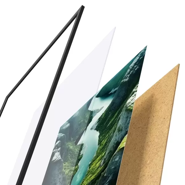 El póster consta de marco, plexiglás, imagen impresa y soporte de aglomerado. El póster puede colgarse inmediatamente en la pared gracias a los soportes de la parte posterior.