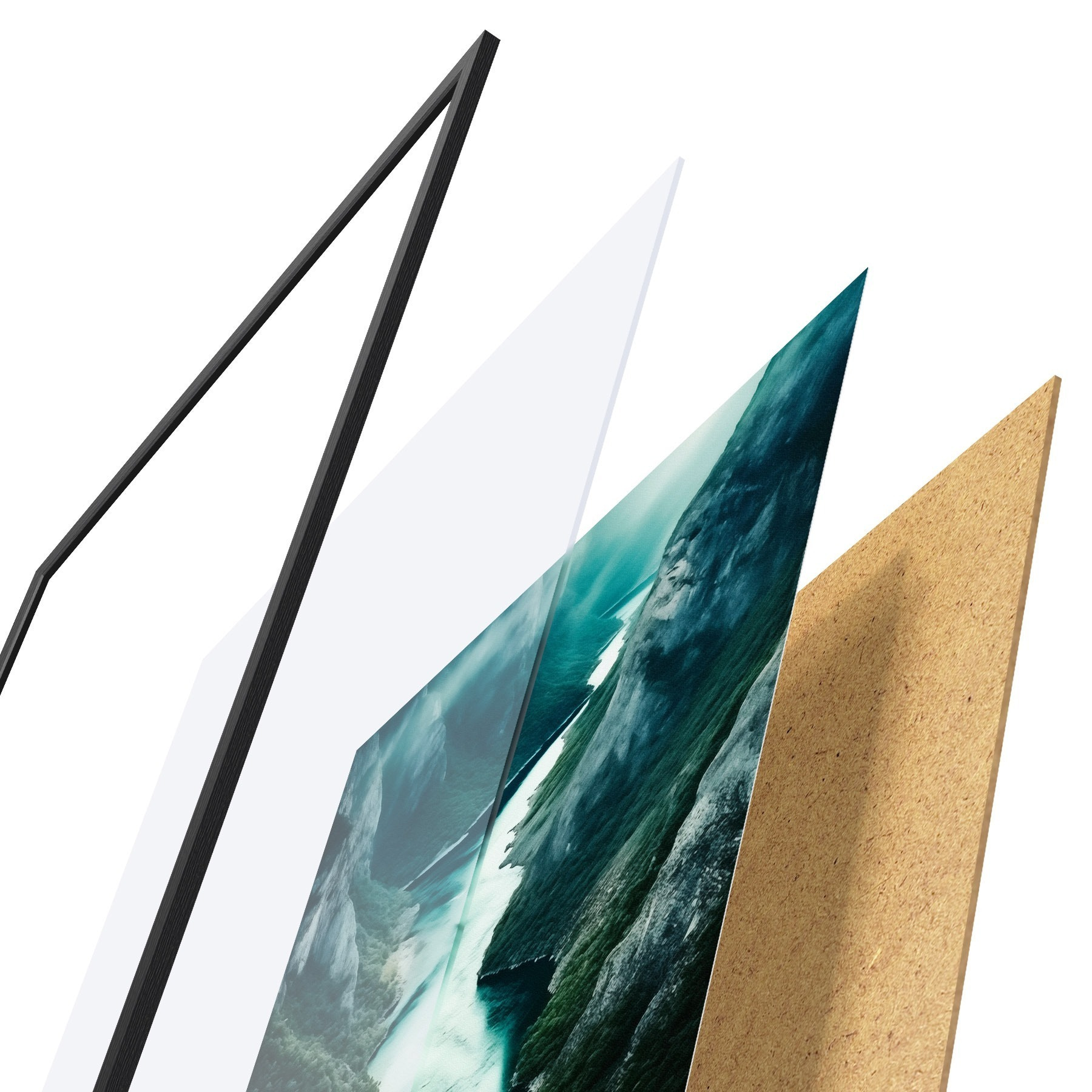 El póster consta de marco, plexiglás, imagen impresa y soporte de aglomerado. El póster puede colgarse inmediatamente en la pared gracias a los soportes de la parte posterior.