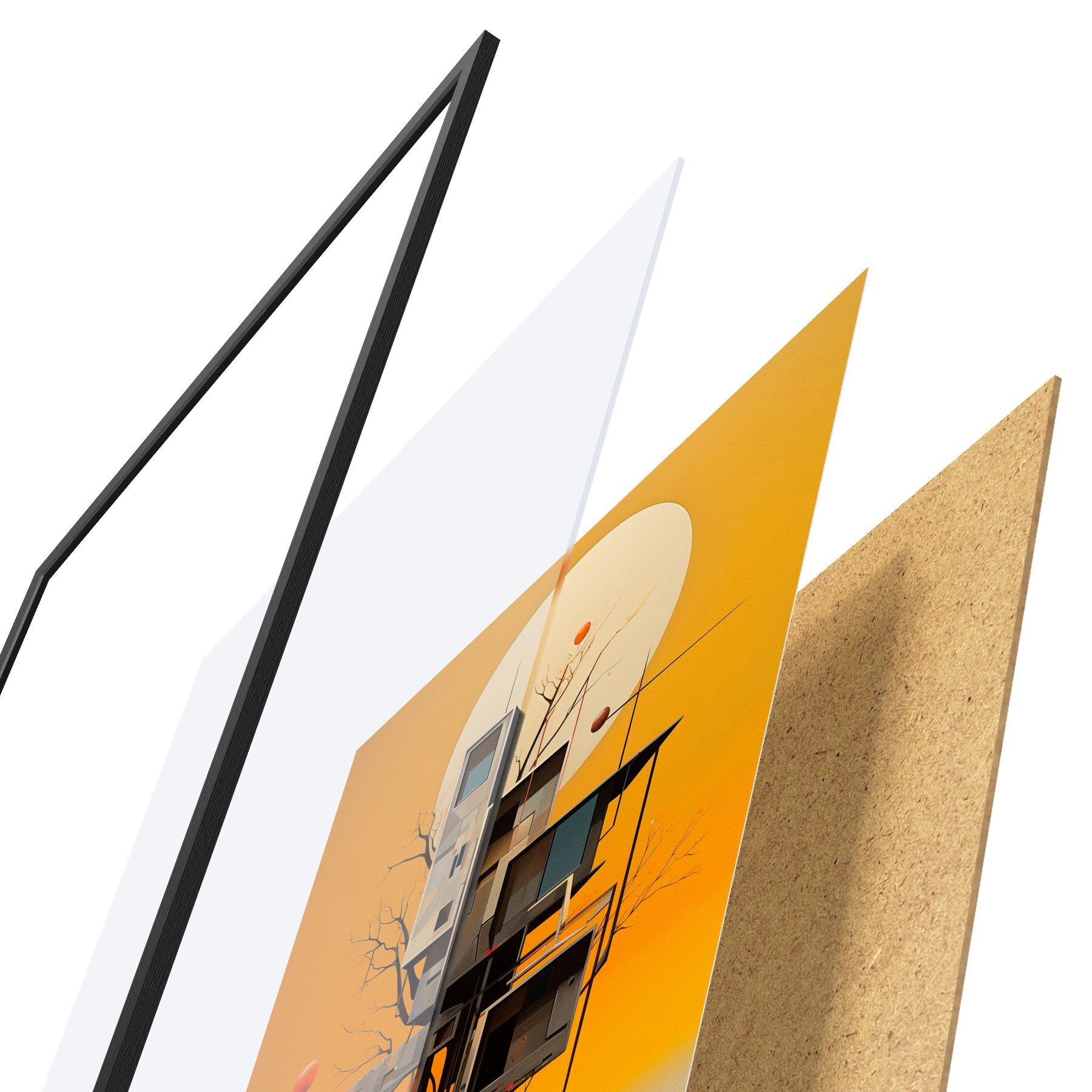El póster consta de marco, plexiglás, imagen impresa y soporte de aglomerado. El póster puede colgarse inmediatamente en la pared gracias a los soportes de la parte posterior.