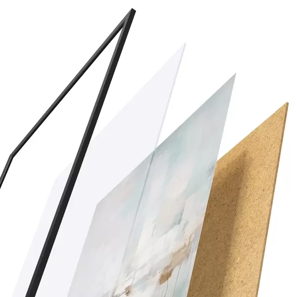 El póster consta de marco, plexiglás, imagen impresa y soporte de aglomerado. El póster puede colgarse inmediatamente en la pared gracias a los soportes de la parte posterior.