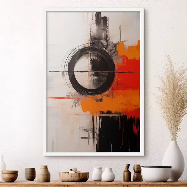 Poster Círculo negro sobre fondo blanco, trazos y salpicaduras naranjas. f46549